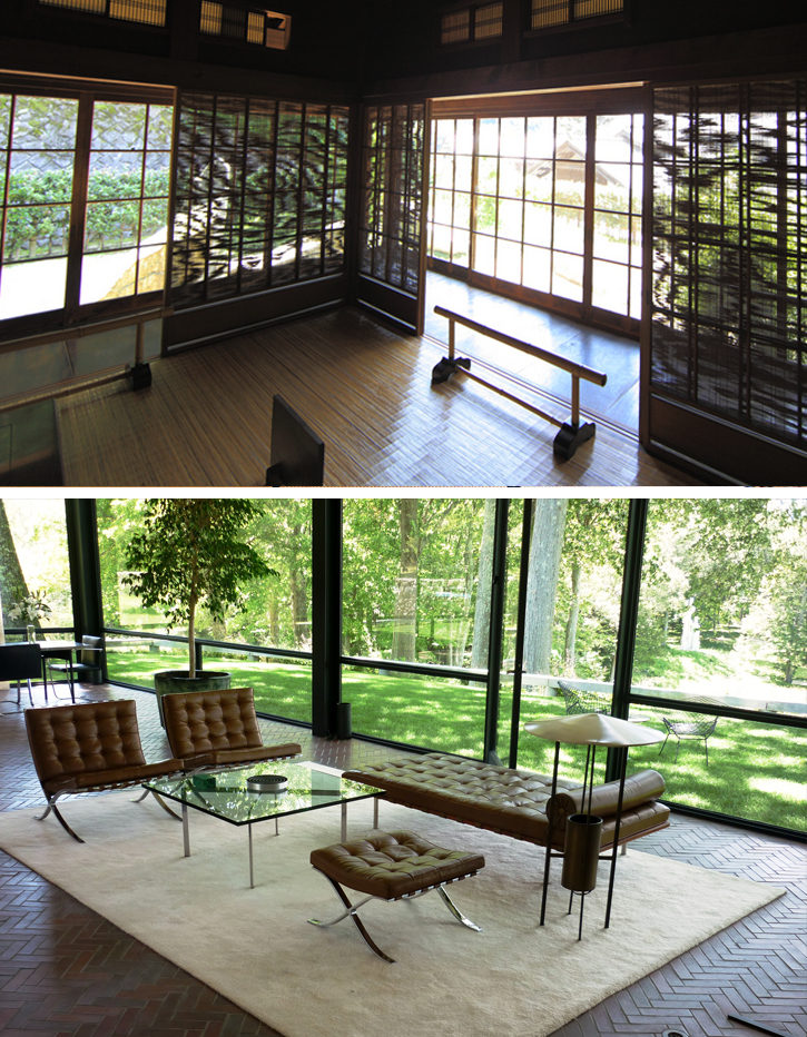 Wood beams stretch across the ceiling of a famous midcentury modern house by Rudolph Schindler
